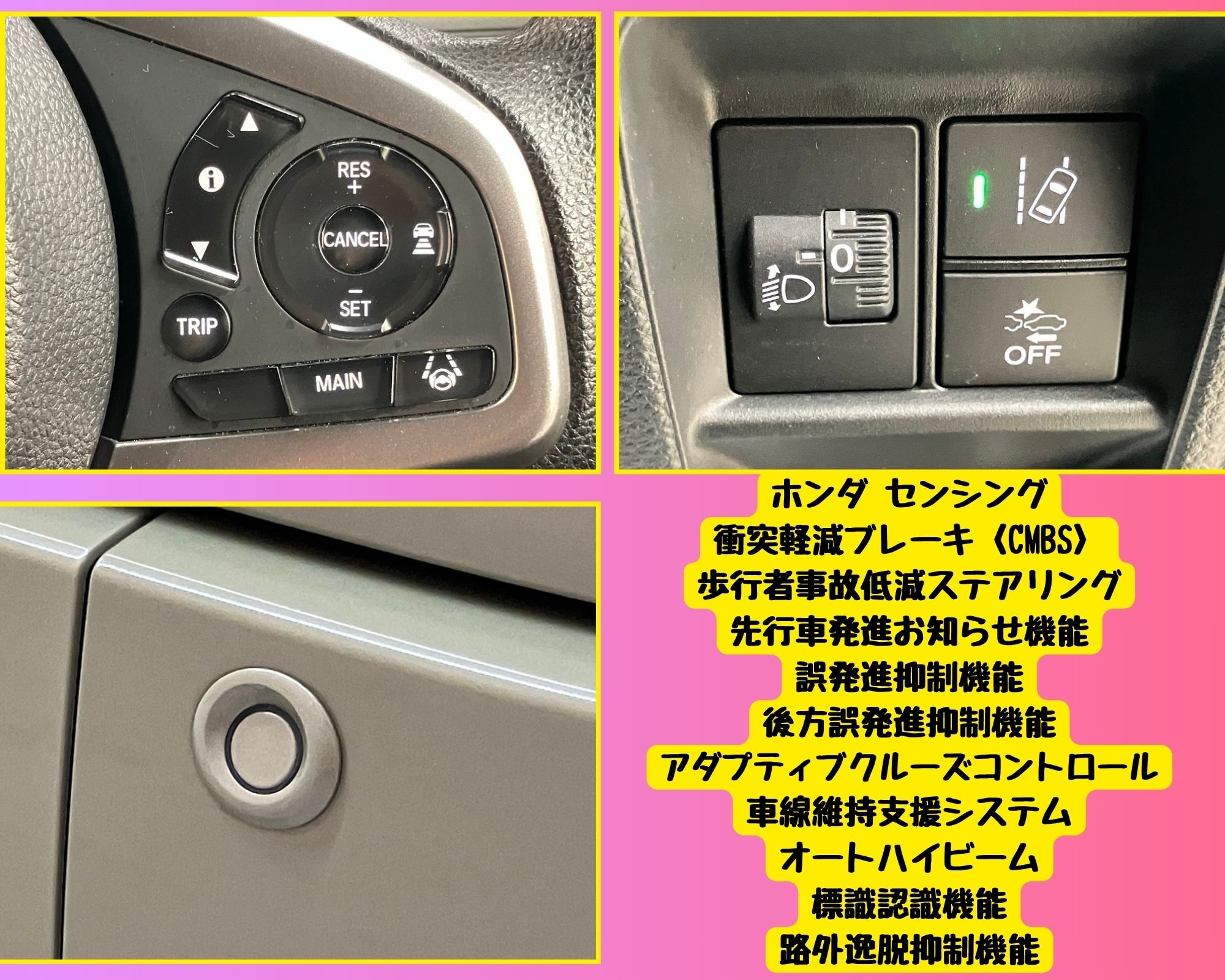 ホンダセンシング レーダークルーズコントロール LKAS(車線維持支援システム) 路外逸脱抑制機能 先行車発進お知らせ機能 標識認識機能 誤発進抑制機能 後方誤発進抑制機能 フロントシートアームレスト(OP) 充電用USBジャック(急速充電対応タイプ2個付)(OP) 電動格納式リモコンカラードドアミラー(OP) PM2.5対応高性能集塵フィルター搭載!